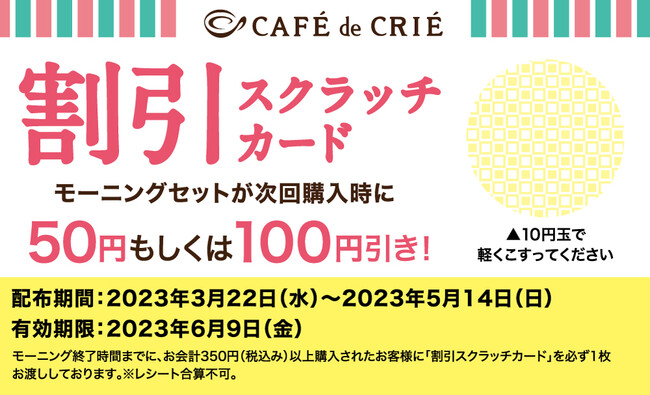 今回モーニングのリニューアルに併せて、2023年3月22日(水)より、モーニングの終了時間までに350円以上商品をご購入いただくと、割引スクラッチカード1枚が必ず貰える「モーニングフェア」を実施いたします。