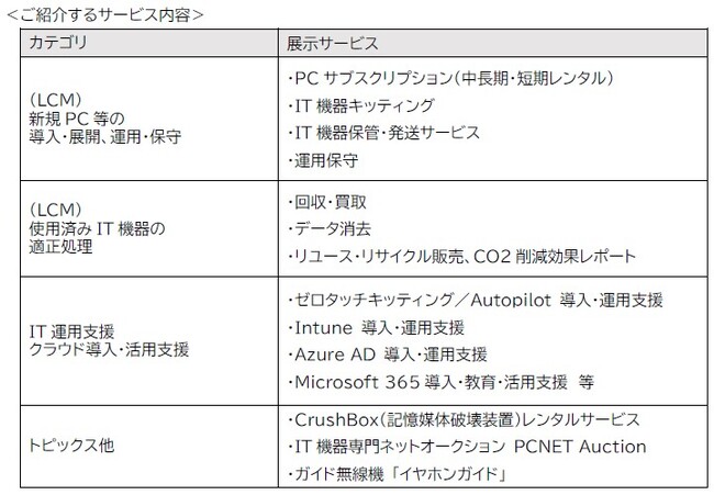 今回の展示会におきましては、「Windows 11リプレース支援」と「情報システム部門の業務負荷軽減」、「使用済みIT機器の適正処理」を主なテーマとして、情報システム部門の「困った」をまるっと解決する、LCM(※1)サービスをご紹介いたします。