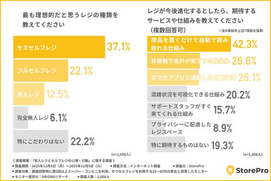 「最も理想的だと思うレジの種類」について尋ねたところ、『セミセルフレジ(商品登録はスタッフ、支払いのみセルフ)(37.1%)』が最も多く、『フルセルフレジ(商品登録から支払いまで全てセルフ)(22.1%)』『有人レジ(スタッフが会計対応)(12.5%)』と続きました。