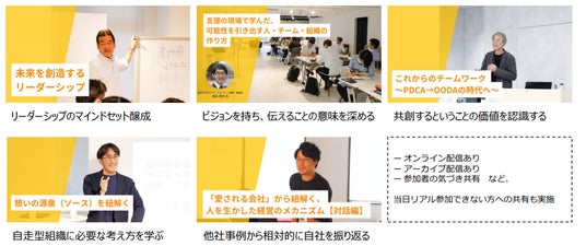 自分たちにとって「いい会社とは何か?」をミドルマネージャーが模索し、自分たちの資産の棚卸を行い、ありたい姿をえがくとともに、実現に向けた行動や対話のプロセスを設計します。また、各社のミドルマネージャーが都度集まり、プログラムで検討する中での課題や悩み事、上手く進み始めていることなどを共有しながら、事務局とアドバイザーも交え、伴走支援を行います。
