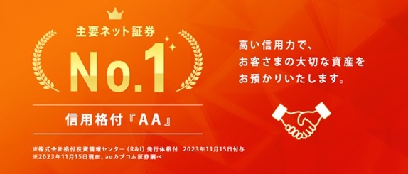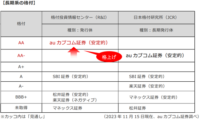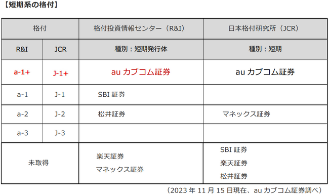 auカブコム証券株式会社(本社:東京都千代田区、代表取締役会長兼社長:二宮明雄、以下「auカブコム証券」)は、2023年11月15日、格付投資情報センター(「以下、R&I」)による発行体及び短期格付が、下表のとおりとなったことをお知らせいたします。