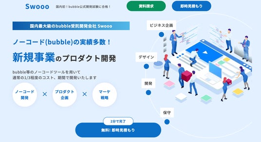 ノーコード受託開発「Swooo」は、「コーディング不要のノーコードツールを活用し、従来よりもコストを抑え、そして早く実現させる」webシステム開発サービスです。