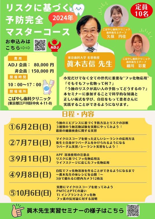 株式会社オール・デンタル・ジャパン(本社:東京都台東区柳橋2-5-6、代表取締役:木下英明、廣田祥司 )は、東京歯科大学名誉教授 眞木吉信先生による「第4期 リスクに基づく予防完全マスターコース」を2024年6月2日(日)から5日間にわたって開催いたします。