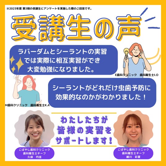 さて、ここで昨年の第3期の受講生にアンケートを行ったところ、全員の満足度が100%という素晴らしい評価をいただきました。東京歯科大学名誉教授の眞木吉信先生とこばやし歯科クリニックのチーフDHや協賛企業のご協力もあり満足度の高い実習体験を実現することができました。受講者たちが自信を深めることができるセミナーとして、皆様からそのようなお声をいただけたことは、主催側としては非常に嬉しく思います。
