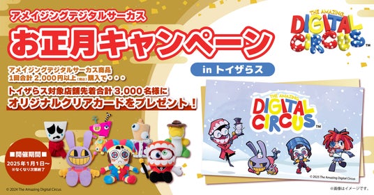 エンターテインメント関連商品を輸入・製造販売するインフォレンズ株式会社(本社:東京都中央区、代表取締役CEO:安川 洋)は、世界的に注目を浴びている人気のダークコメディCGアニメーション「The Amazing Digital Circus(アメイジングデジタルサーカス)」の関連商品を全国のトイザらス店舗にて2,000円(税込)以上お買い上げで、オリジナルクリアカードをプレゼントする「アメイジングデジタルサーカスお正月キャンペーンinトイザらス」を2025年1月1日(水)より開催することを発表いたします。