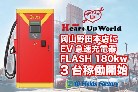 テンフィールズファクトリー株式会社(本社:京都府相楽郡精華町光台1-7 けいはんなプラザ9F、代表取締役:市川裕)は、岡山市の「ハートアップワールド」(本社: 岡山県岡山市北区野田2丁目14−28、代表者:佐藤 義寛)岡山野田本店において、当社が販売・設置・運営を行う超急速EV充電器「FLASH」(最大出力180kW)3基が稼働開始したことをお知らせいたします。FLASH3台設置の充電ステーションは岡山県初となります。