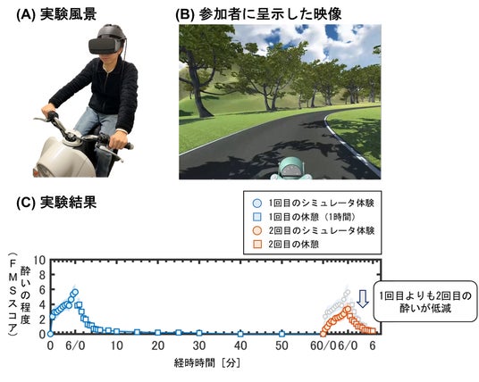 実験の参加者(60名)は、実験室内でバイク型筐体に乗った状態でヘッドマウントディスプレイを装着し [図1(A)]、バイクが左右に蛇行するシミュレータ映像 [図1(B)] を体験しました。各参加者、6分間のシミュレータを、休憩を挟んで2回体験しました。1回目と2回目のシミュレータを体験するあいだの休憩時間の長さが異なる次の3グループを設けました:1.6分間(20名)、2.酔いが回復するまで(20名)、3.1時間(20名)。3グループともに、2回目のシミュレータ体験後に6分の休憩をとりました。参加者はシミュレータ映像を見ている最中と休憩中に、主観的な酔いの程度(FMS)を20段階で回答しました。