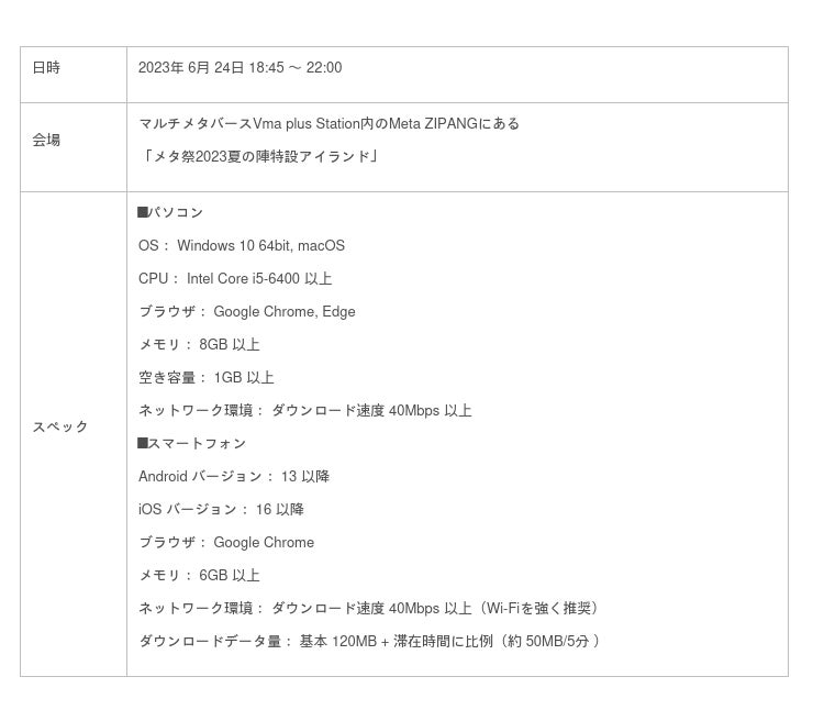 メタバースWeb3のコンテンツ企画・ディレクションを行うVma plus(ブイマプラス)株式会社(本社:東京都品川区、代表:津田徹)は、東京タワーとメタバース会場で同時開催するイベント「メタ祭2023夏の陣」のライブ配信コンテンツとしてVTuber・バーチャルシンガー15名によるメタバース音楽ライブ「EPIPIVOX(エピピボックス)」を配信することを発表します。