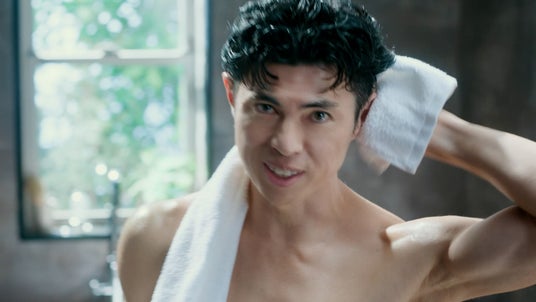 シャワーを浴びる小島さんの引き締まった背中と真剣な眼差し。毛穴に詰まった頭皮アブラを「ミクロ分解バブル」で一発洗浄する爽快感を表現し、最後はタオルで髪を拭きながら「落とすって気持ちウィー」と決める。