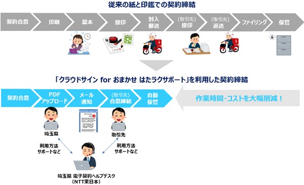 Web完結型クラウド契約サービス「クラウドサイン for おまかせ はたラクサポート」を提供する東日本電信電話株式会社 埼玉事業部(執行役員 埼玉事業部長:石川 達(以下「NTT東日本」と記載)は、埼玉県(知事:大野 元裕)と「クラウドサイン」を提供する弁護士ドットコム株式会社(東京都港区、代表取締役社長:内田陽介)と三者協定を締結し、埼玉県のDX推進に向けた取り組みの一環として、電子契約の導入に向けた業務プロセスを検証する実証実験を開始いたします。