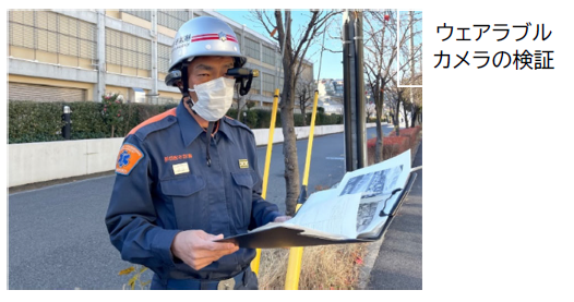 職員が災害現場で、使いやすいカメラを検証するため、3種類のウェアラブルカメラを試用し、現場映像を本部に共有することで使用感を確認しました。