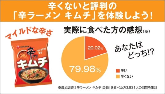 当社が行った調査によると、実際に「辛ラーメン キムチ」を食べた3,831人の中で、「辛くない」という回答は79.98%に上りました。「辛ラーメンの味は好きだけど、辛いのは苦手…」という方にもぜひお試しいただきたいです。