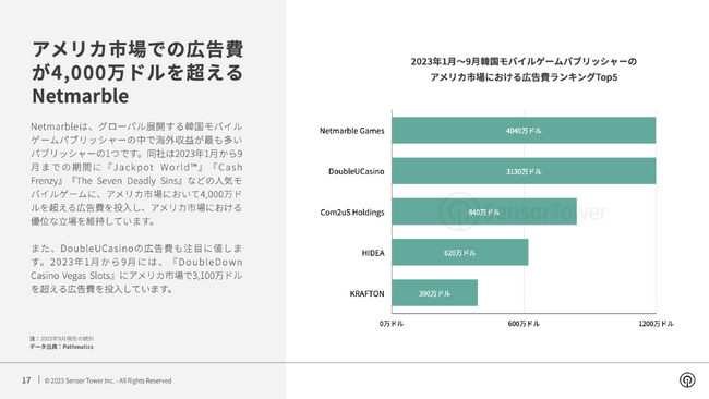Netmarbleは、グローバル展開するトップパブリッシャーの1つとして、2023年1月から9月までの期間に『Jackpot World(TM)』など多数のモバイルゲームに関し、アメリカ市場で4,000万ドルを超える広告費を投入して、アメリカ市場における優位な立場を維持しています。