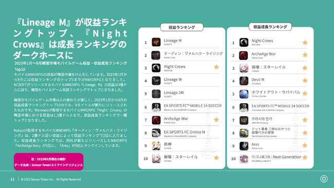 2023年1月から9月には、NCSOFTが配信するモバイルMMORPG『Lineage M』の収益が3億ドルに迫り、韓国モバイルゲーム収益ランキングで首位に立ちました。Wemadeが配信するモバイルMMORPG『Night Crows』の韓国市場における収益は1.3億ドルとなり、収益成長ランキングで一躍首位となりました。