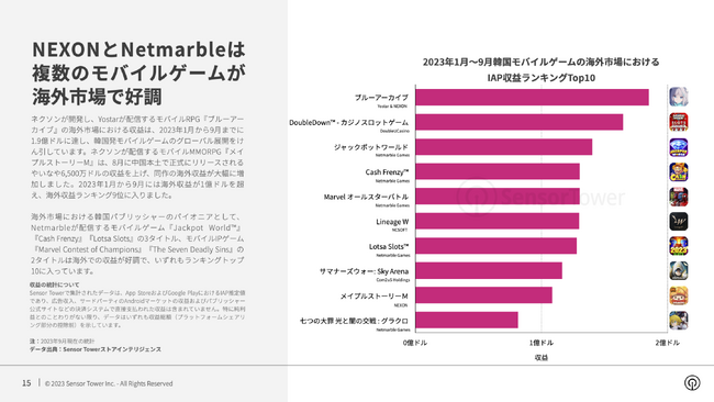 2023年1月から9月の海外市場における収益については、NEXONがリリースする『ブルーアーカイブ』が1.9億ドル、『メイプルストーリーM』が1億ドルとなり、韓国モバイルゲームのグローバル展開をけん引しています。