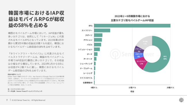 韓国のモバイルゲーム市場においてIAP収益が最も多いカテゴリは、依然としてRPGとなっています。2023年第1四半期から第3四半期の収益は20億ドルを超え、韓国におけるモバイルゲーム総収益の58%を占めています。ランキング2位は、収益が4.2億ドルに達するストラテジーゲームで、総収益の12%を占めています。