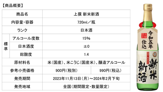 大関株式会社(社長:長部訓子/兵庫県西宮市)は、この秋に収穫したばかりの新米を100%使用した若々しくフレッシュな味わいの「上撰 新米新酒720ml瓶詰」を2023年11月13日(月)から期間限定・数量限定で発売します。