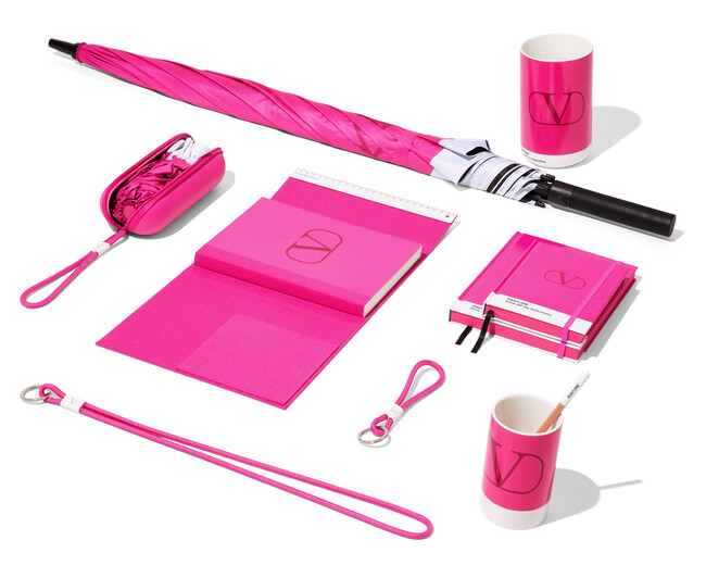 このコラボレーションを記念し、ヴァレンティノとパントン社は、デンマークのオブジェクトディベロッパー、Copenhagen Design ApSとともにPINK PPの限定商品を制作しました。キーチェーンから、ノート、ロゴ入りの傘まで、唯一無二のカラー、PINK PPをまとった商品が展開されます。プレミアムな素材を使用し、メゾンのロゴがあしらわれたこれらのアイテムにはそれぞれ、アイコニックなパントンチップのデザインが反映されています。
