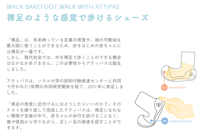 Attipas(アティパス)は、成長によって変化する赤ちゃんの足に着目し、産学共同で7年にも及ぶ研究の結果に基づいて作られた歩育シューズです。2009年にスタートし、今ではオーストラリア、スペイン、アメリカなど世界30ヵ国以上のママやパパに愛される安心、安全のブランドです。