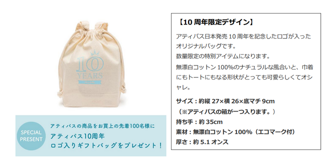 10月10日(火)の赤ちゃんの日から、アティパス公式オンラインサイト(https://attipas.jp/)にてお買上の先着100名様に、「アティパス10周年ロゴ入りギフトバッグ」をプレゼントいたします。