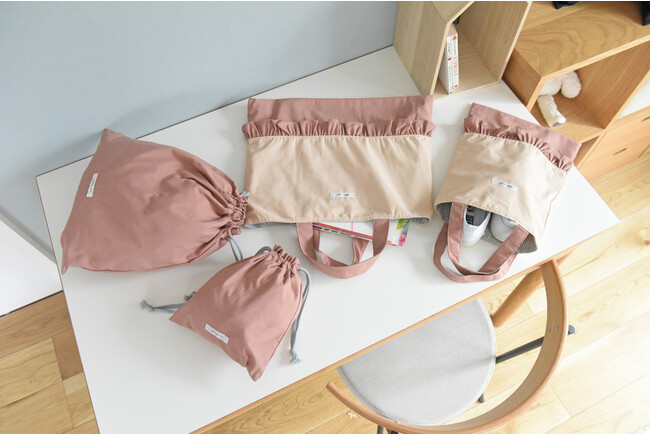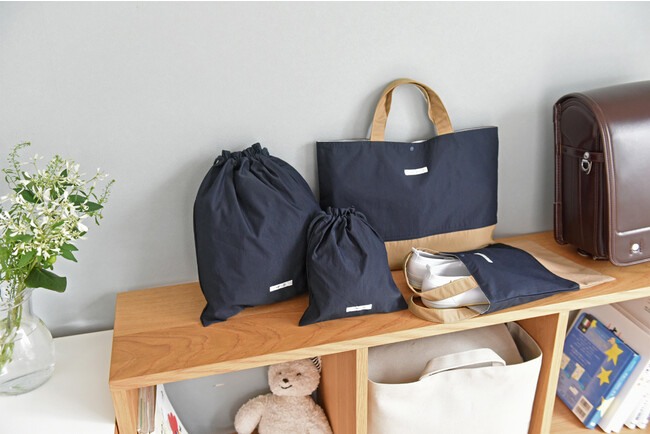 まず揃えたい基本の4アイテムは、セット販売も。ランドセルに入らない荷物の持ち運びに便利な手提げ「レッスンバッグ」、上履きの持ち帰りに必須の「シューズバッグ」、体操着などの持ち運びにちょうど良い「巾着大」、給食用のランチョンマットやコップを入れられる「巾着小」の4点セットで販売しています。