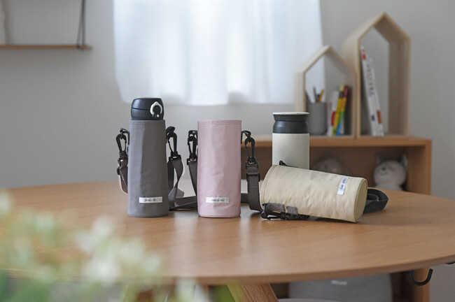 持ち手のあるコップ型の蓋付き水筒も入れやすい、スリット入りのデザイン。水筒だけでなく500mlペットボトルも入れられるサイズなので、休日のピクニックなど幅広いシーンで使うことができます。