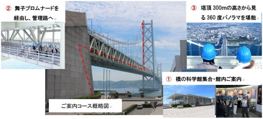 1.橋の科学館(集合)~ツアー説明後橋の科学館見学 ~ 舞子海上プロムナード経由 ~ 2.明石海峡大橋管理路 ~ 3.明石海峡大橋主塔(2P) ~ 明石海峡大橋管理路 ~ 舞子海上プロムナード経由 ~ 橋の科学館(解散)