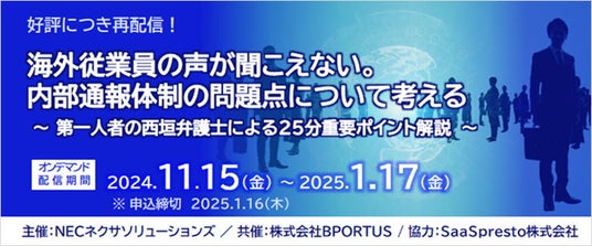 NECネクサソリューションズは、8月15日まで開催しました「これからの時代に即したグローバル内部通報体制のポイントとは?」オンデマンドセミナーの視聴期間をご好評につき2025年1月17日まで延長します。(※セミナータイトル変更) お申し込みは1月16日(木)まで受け付けています。