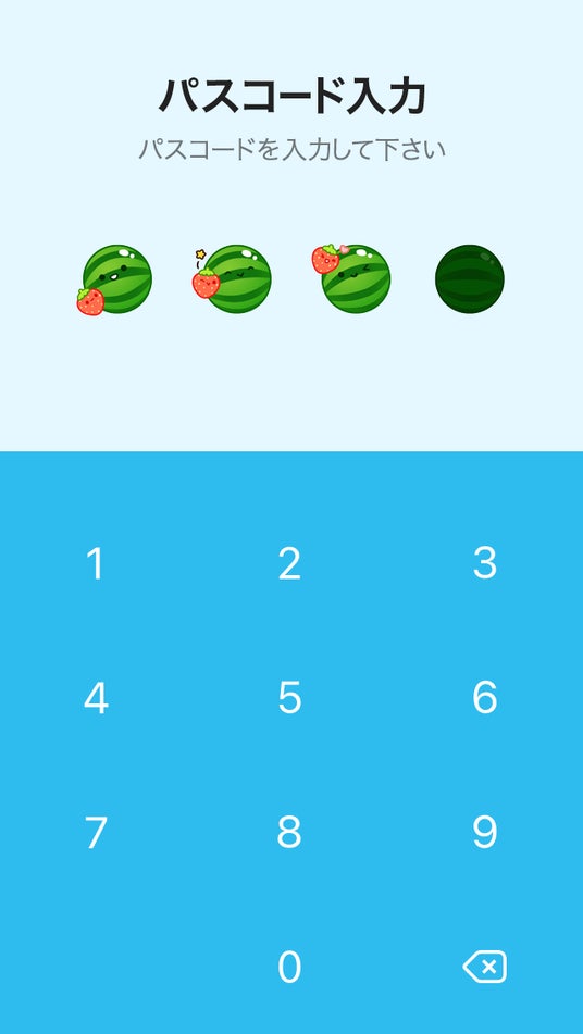 その他、メニューアイコンには各メニューの内容にあわせたフルーツたちが登場、パスワード画面では大きいスイカと小さいいちごが4コマで連続するデザインで、さりげない工夫を加えました。