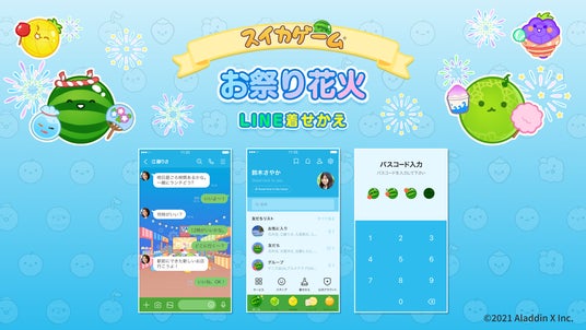 今回のLINE着せかえのテーマは“夏祭り+ゲーム大会”です。7月27日のスイカの日に実施をしたAladdin X主催としては初のリアルイベント「スイカゲーム 夏のスイカ大収穫祭」での賑やか雰囲気を演出しながら夏の要素を加えました。