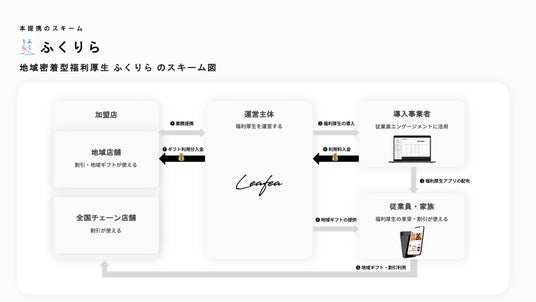 リーフィが提供する地域密着型福利厚生サービス(専用アプリ名称:「ふくりら」)は、第三の賃上げとも言われる企業の従業員向け福利厚生の充実を通じて、企業の従業員を支援するサービスです。アプリを通じて、従業員へのギフト還元や従業員の家族も利用できるクーポンを提供するほか、導入企業で働く従業員の働きがいやエンゲージメント向上を支援する内容となっています。
