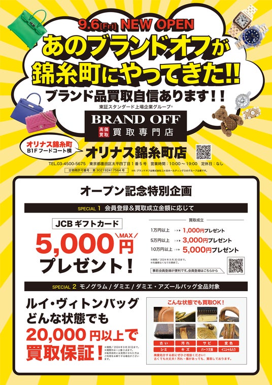 中古ブランド品のバッグ・時計・宝飾品などを扱うブランドリユースシェアNo.1(※)のコメ兵ホールディングスグループの一翼である株式会社K-ブランドオフ(石川県金沢市)は、東京都墨田区にFC41店舗目となる「ブランド買取専門店 BRAND OFF オリナス錦糸町店」をオープンいたします。 ※ 「リユース市場データブック2023」((株)リフォーム産業新聞社調べ)