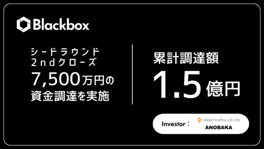 株式会社Blackboxは、ニッセイ・キャピタル株式会社をリード投資家として、シードラウンドのセカンドクローズにて7,500万円の資金調達を実施いたしました。これにより、累計調達額は1.5億円となりました。