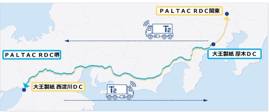 上記のレベル4自動運転トラックによる幹線輸送の開始に先立ち、自動運転トラックで持続可能な物流が実現できるかを確かめるべく、T2が開発したレベル2*³自動運転トラックで、関東・関西にそれぞれ所在する大王製紙の物流センター(DC)とPALTACの大型物流センター(RDC)の間で貨物を輸送し、オペレーションの有効性を検証します。