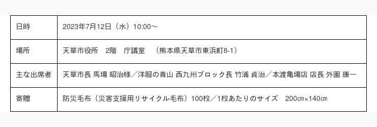 青山商事株式会社(本社:広島県福山市/代表取締役社長:青山理(おさむ))は、当社として全国で初めてとなる「防災に関する連携協定」を、熊本県天草市と締結し、7月12日(水)に天草市役所にて協定式を開催します。またこの締結に際して、同日に防災毛布(災害支援用リサイクル毛布)100枚を寄贈いたします。