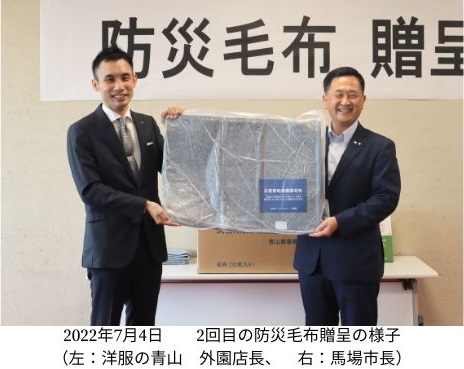 当社では、1.過去に大規模な自然災害を経験した地域であること 2.災害発生時に物資が届きにくい離島や遠隔地であること 3.当社店舗を営業している地域であること の3つを基準に、防災毛布寄贈の取り組みを行っています。天草市は、御所浦島などの“離島”を有するという地域特性があるとともに、「令和2年7月豪雨」を経験されていること、当社店舗「洋服の青山 本渡亀場店」があることから、同市へ2021年・2022年に防災毛布を100枚ずつ(計200枚)寄贈し災害対策の強化にお役立ていただいています。