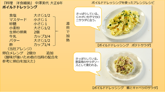 レシピを参考に再現した結果、オリーブオイルを使用したり、乳化機を使わない手作りのマヨネーズは当社商品開発の従業員の試食では、非常に油っぽく、重く感じました。当時の料理書では、マヨネーズはチキンやえび、カニに合わせたレシピが多く、野菜やポテトサラダには、さっぱりとしたボイルドドレッシングが適するなどの記載が多く見受けられました。料理に合わせてマヨネーズやボイルドドレッシングのようなサラダ用の調味料が使い分けられたようです。牛乳やバターなどの乳製品は、日本では高価だったためかそれらを使用しないドレッシングのレシピも作られていました。昭和30年代に手作りより口当たりが軽い工場製マヨネーズが普及していくにつれて料理書でも見られなくなり、これらのサラダ用の調味料のレシピは工場製マヨネーズに集約されていきました。