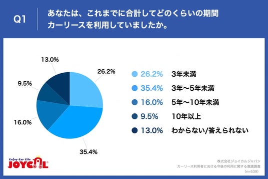 近年は、自動車の利用に対するニーズが日々変わり、所有せずに利用するニーズが高まっています。様々な業界にサブスクリプションサービスが登場し、自動車業界でもカーリースやカーシェアリングサービスを展開する企業が増え、クルマは必要な時に利用する一つの移動手段と変化しています。そこで現状を把握するために、カーリースを利用したことがある人539名を対象に「カーリース利用者における今後の利用に関する意識調査(※2)」を実施したところ、現在もカーリースを利用する人の93.5%が、「今後もカーリースを利用したい」意向であることがわかったことに加え、6割以上が、カーリース利用期間の合計が「5年未満」という結果が出ています。
