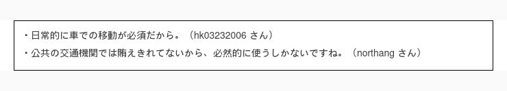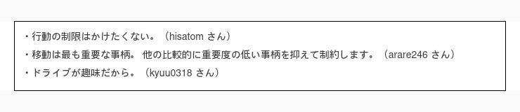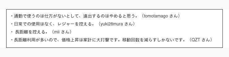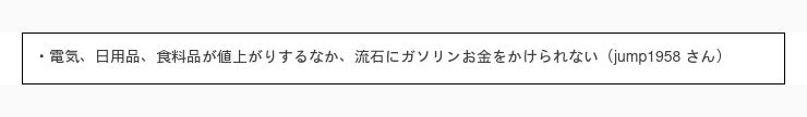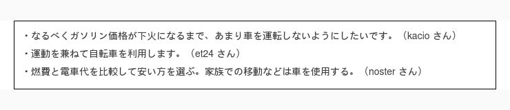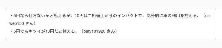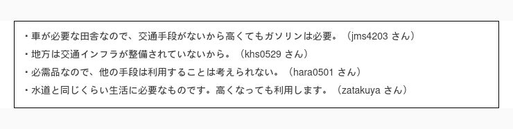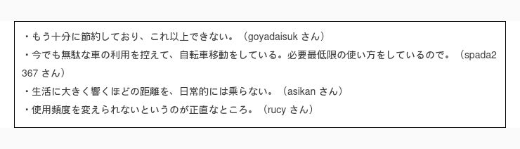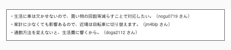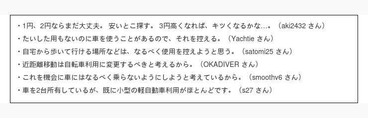 まずは一番多かった回答 10円 /L 以上値上がりしたら日常生活での車の使用頻度を控える と回答された方の意見を見てみましょう。
