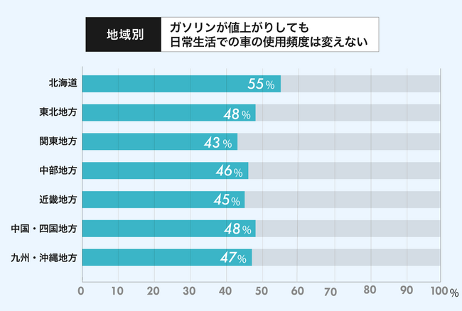 お住いの地域別に「ガソリンが値上がりしても 日常生活での車の使用頻度は変えない」と回答された方の割合を見てみましょう。