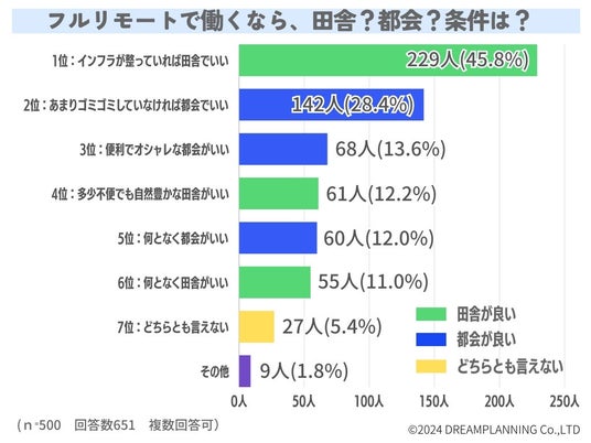 フルリモートで働くなら、田舎と都会のどっちに住む?条件は? (n=500 回答数651 複数回答可)