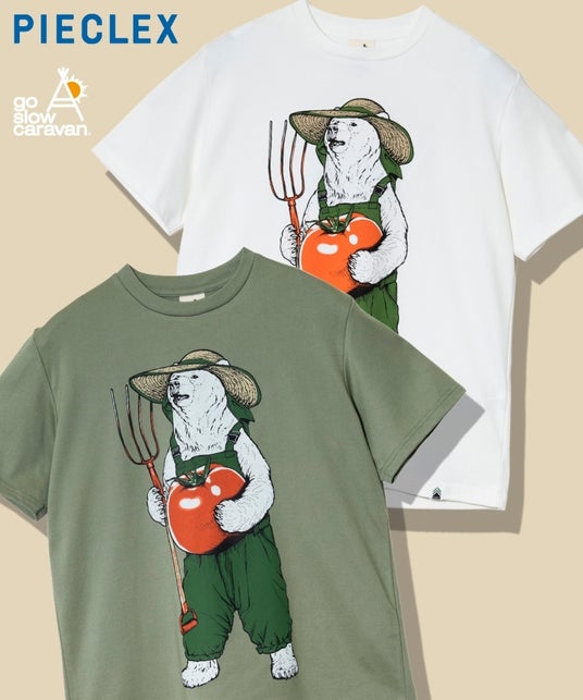ピエクレックスが推進する回収・堆肥化システム「P-FACTS(ピーファクツ)」をモチーフに、使い古した製品が堆肥となり育てられる“トマト”を手に農作業に励む「ファーマークマ」や、夏野菜をgo slow caravanのロゴに組み合わせたユニークなデザインが採用されています。