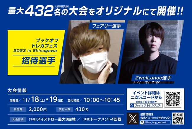 イベント当日は、最大400名以上が参加する大会を実施し、フェアリー選手・ZweiLance選手が、それぞれ招待選手として参加いたします。その他、ティーチング、フリー対戦(ガンスリンガー形式)をはじめ、物品販売や、トレカ専門スタッフによる買取査定を行います。ブックオフ店舗同様に初心者から上級者、ご家族連れまで幅広い層にお楽しみいただけますのでお気軽にお立ち寄りください。