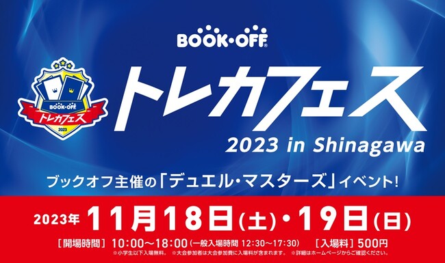 ブックオフグループホールディングス株式会社(本社:神奈川県相模原市、代表取締役社長:堀内康隆)の子会社で、リユースショップ「BOOKOFF」等を運営するブックオフコーポレーション株式会社(神奈川県相模原市、代表取締役社長:堀内康隆、以下、ブックオフ)は、トレーディングカードゲーム「デュエル・マスターズ」イベント『ブックオフ トレカフェス 2023 in Shinagawa』を、2023年11月18日(土)、19日(日)に、東京流通センター第一展示場Aホール(所在地:東京都大田区平和島)で実施いたします。
