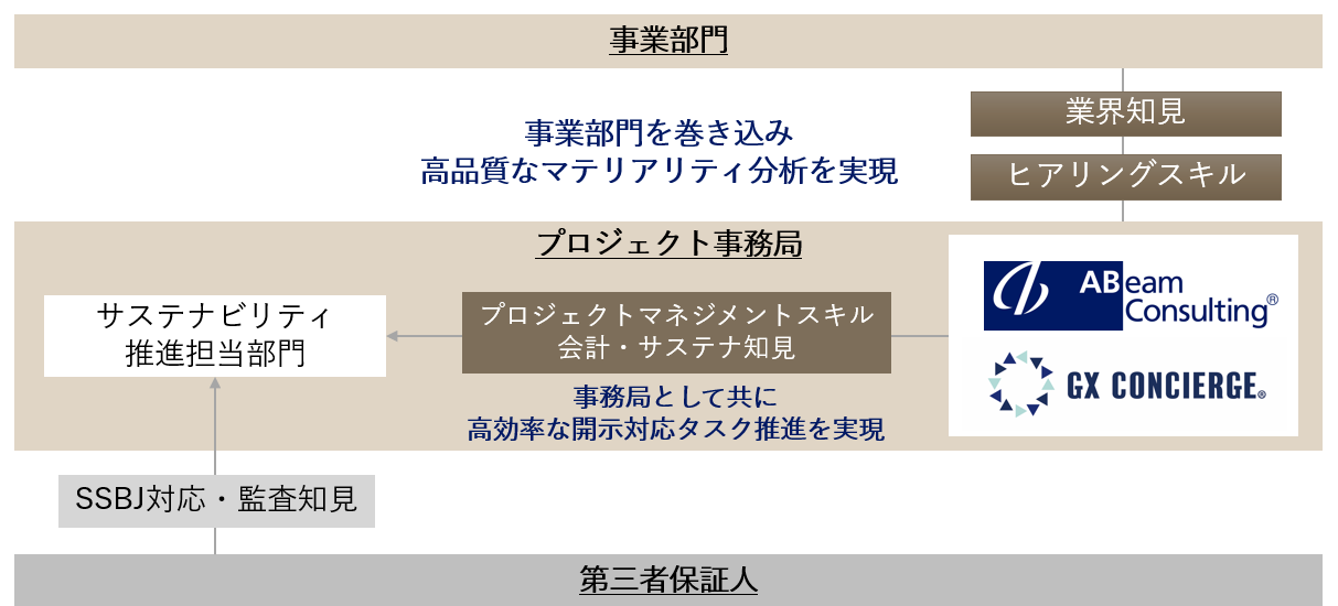 社内各種ステークホルダーとの調整、第三者保証人との協議を含めてサステナビリティ推進担当部門が直面する複雑な業務を伴走支援