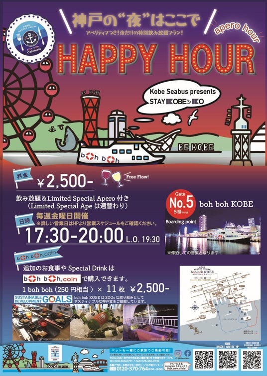 神戸シーバス boh boh KOBEでは、毎週金曜日の17時30分から、停泊した状態で 船上ビアガーデン『KOBE⚓️KO HAPPY HOUR』を開催しています。