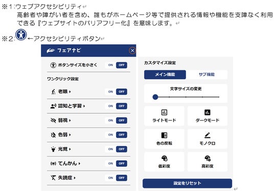 本サービスの導入によりウェブサイトの右上に配置したアクセシビリティボタン(※2)から簡単に文字サイズの変更や老眼、弱視、色弱、光覚、てんかん、失読症など個々の特性によって自由にウェブサイトの見え方を変更できるようになりました。