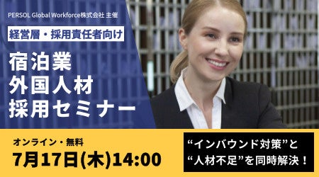 パーソルグループで外国人材に特化した人材サービスを提供するPERSOL Global Workforce(パーソル グローバルワークフォース)株式会社(本社:東京都港区、代表取締役社長:多田 盛弘)は、2025年7月17日(木)に宿泊業関係の経営者・採用責任者向けに「外国人材採用セミナー」を開催します。ホテル、旅館などの宿泊施設ではさまざまな分野(業務)において人材が不足しており、今回はそれぞれの業務を担当できる外国人材の在留資格・分野を網羅した形で、採用に関する具体的なステップを解説します。なお、本セミナーはオンライン開催、参加無料です。