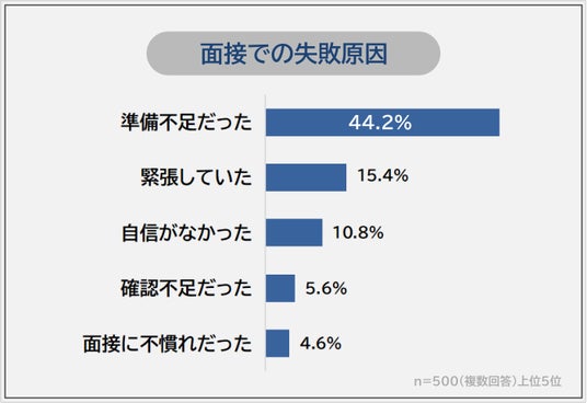 「面接での失敗原因」の圧倒的1位は「準備不足だった(44.2%)」です。2位「緊張していた(15.4%)」、3位「自信がなかった(10.8%)」が続きます。