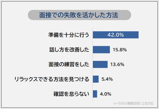 「面接での失敗を活かした方法」を聞いたところ、ダントツは「準備を十分に行う(42.0%)」でした。2位「話し方を改善した(15.8%)」、3位「面接の練習をした(13.6%)」も多くなっています。